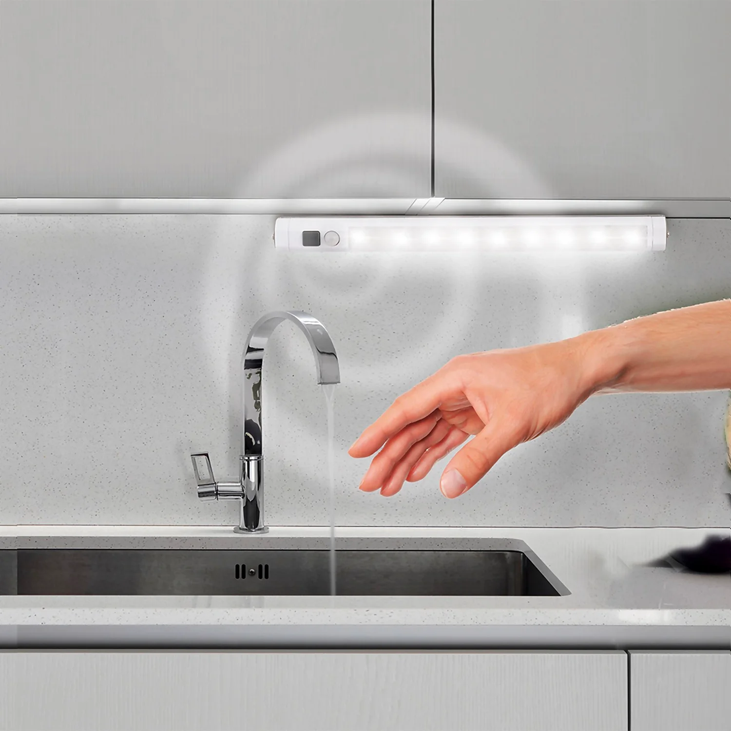 The Arlec Battery Operated LED Under Cabinet Sensor Light works using Passive Infra-Red (PIR) technology, which means it lights up when motion is detected.