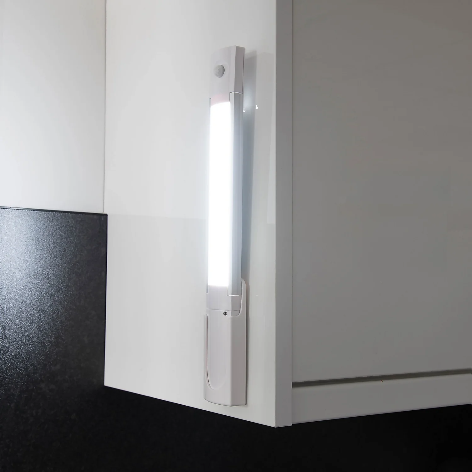 The Arlec Battery Operated LED Under Cabinet Sensor Light works using Passive Infra-Red (PIR) technology, which means it lights up when motion is detected.